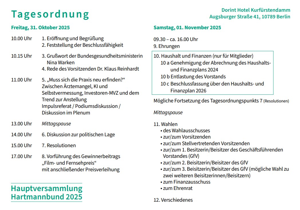 Die diesjährige Hauptversammlung des Hartmannbundes findet am 31. Oktober und 1. November 2025 im Dorint Hotel Kurfürstendamm, Augsburger Str. 41, 10789 Berlin statt.